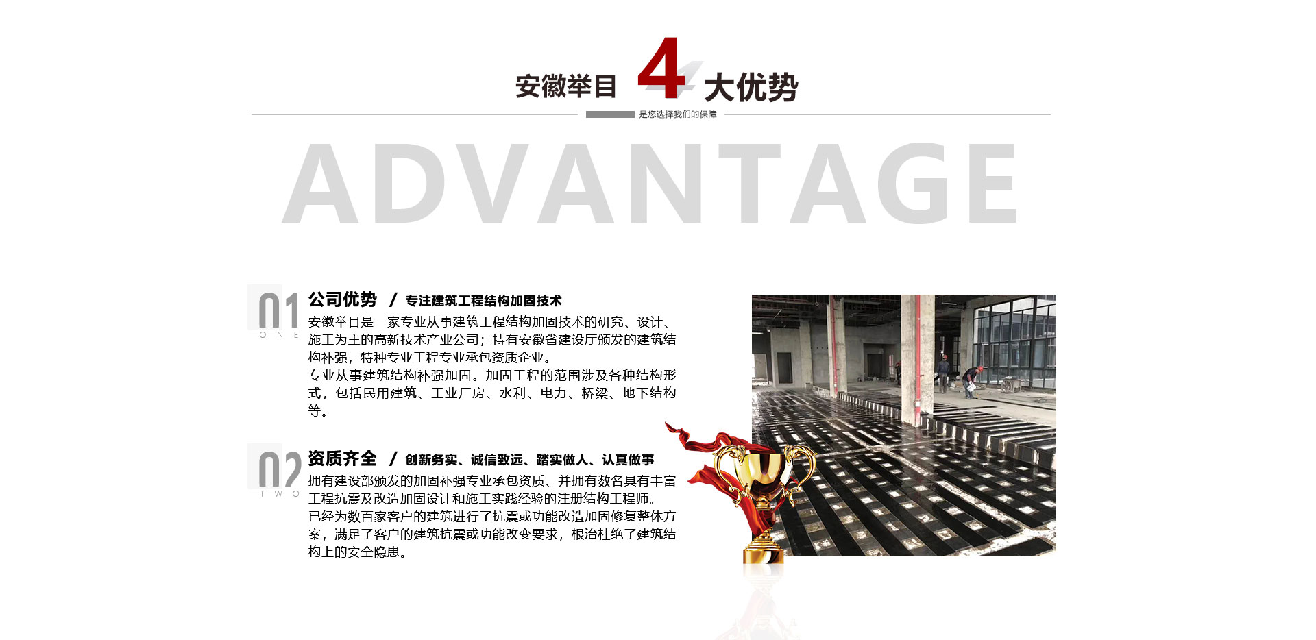安徽舉目工程加固有限公司是一家專業(yè)從事建筑工程結(jié)構(gòu)加固技術(shù)的研究、設(shè)計、施工為主的高新技術(shù)產(chǎn)業(yè)公司,成立于2012年。持有安徽省建設(shè)廳頒發(fā)的建筑結(jié)構(gòu)補強,特種專業(yè)工程專業(yè)承包資質(zhì)企業(yè)。專業(yè)從事建筑結(jié)構(gòu)補強加固。加固工程的范圍涉及各種結(jié)構(gòu)形式,包括民用建筑、工業(yè)廠房、水利、電力、橋梁、地下結(jié)構(gòu)等。公司依托高校土木建筑學(xué)院、省建筑科學(xué)研究機構(gòu)專業(yè)從事建筑結(jié)構(gòu)加固、檢測、鑒定、設(shè)計、施工、公司擁有建設(shè)部頒發(fā)...